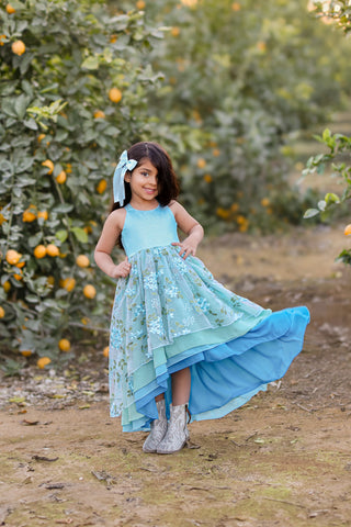 Step into the enchanting world of the "Monet's Garden Dress"—where layers of aqua silk and delicate florals dance with golden sunlight. Perfect for twirling through citrus groves or making grand entrances at garden parties, this dress turns every moment into a masterpiece.